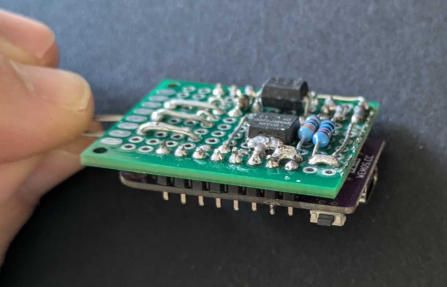 Le shield maison soudé sur un Wimos S2 Mini.