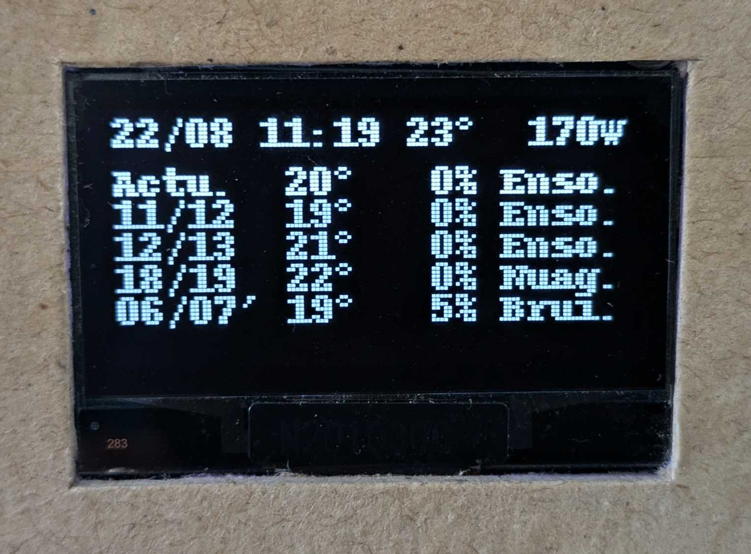 Seul du texte statique est affiché et le nombre de caractères est limité. Il serait possible d'afficher plus de données en ajoutant un déroulement automatique comme le montre cet exemple. Cela permettrait d'afficher plus de créneaux horaires ou plus d'informations par créneau, comme le vent ou l'humidité.
